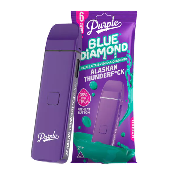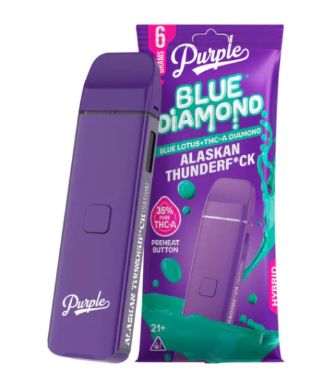 Purple Blue Diamond THCA Disposable 6g blends consist primarily of high percentages of Delta 8 THC and THCA derived from hemp. The assortment of Purple Blue Diamond THCA Disposable 6g blends are as follows: