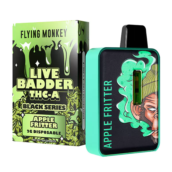 Flying Monkey Live Badder THCA Black Series Disposable 2g blends consist primarily of high percentages of Delta 8 THC, THCA and THCP derived from hemp. The assortment of Flying Monkey Live Badder THCA Black Series Disposable 2g blends are as follows: